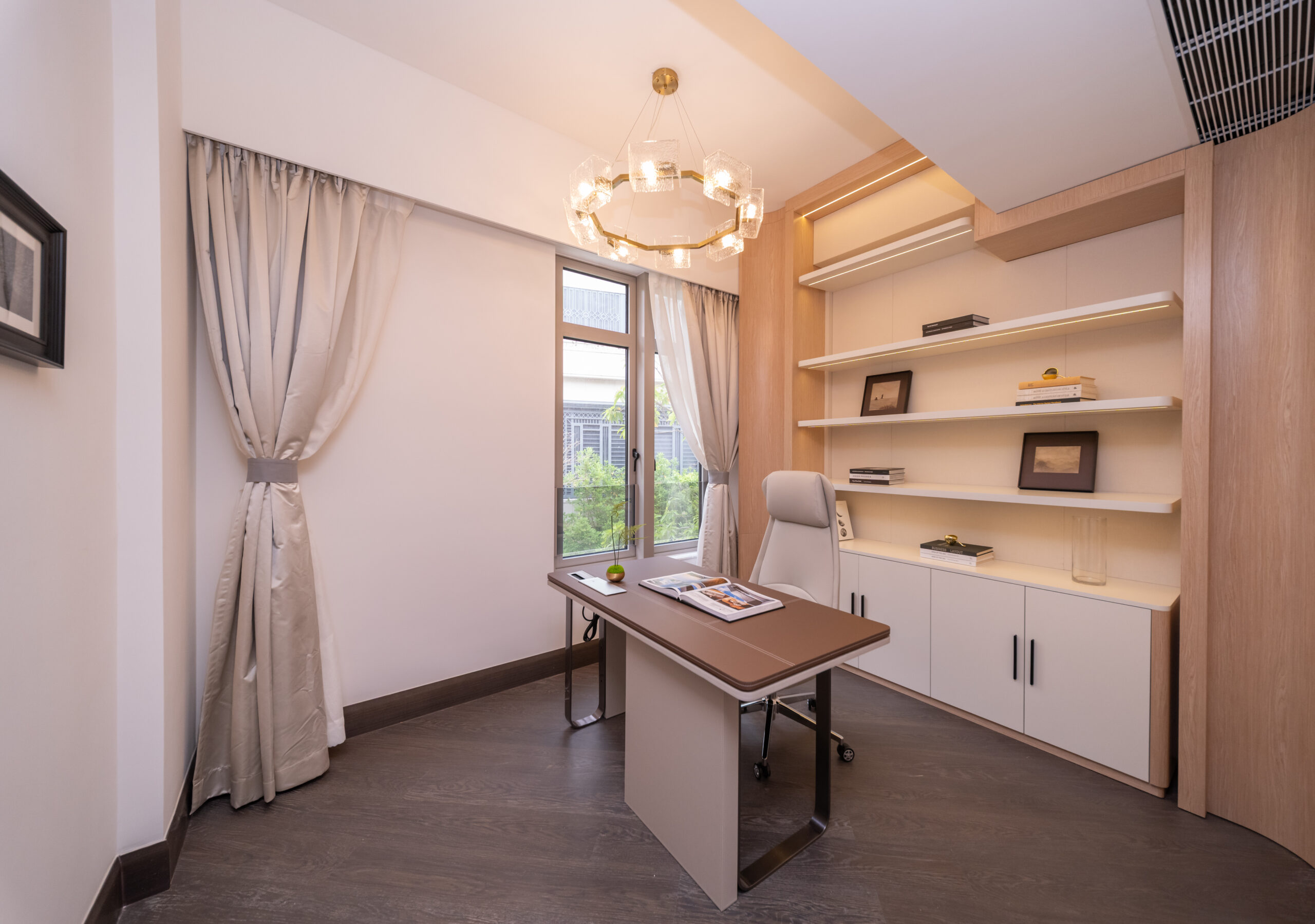 全新打造之連傢俬示範洋房為坐落於臨海第二排「Beryl Avenue」的15號洋房,尊設專屬名字「Laurel」。是希臘神話中的月桂樹,象徵榮耀與卓越,寓意居所尊貴非凡。洋房實用面積為2,695方呎,屬四房兩套連書房、工人房、工作間、兩個儲物房、前後花園及天台間隔。設計以「輕奢詩意」為主題,透過精選紋理與俐落線條交織,塑造層次分明的臨海大宅,將海岸風光與當代生活美學融為一體。