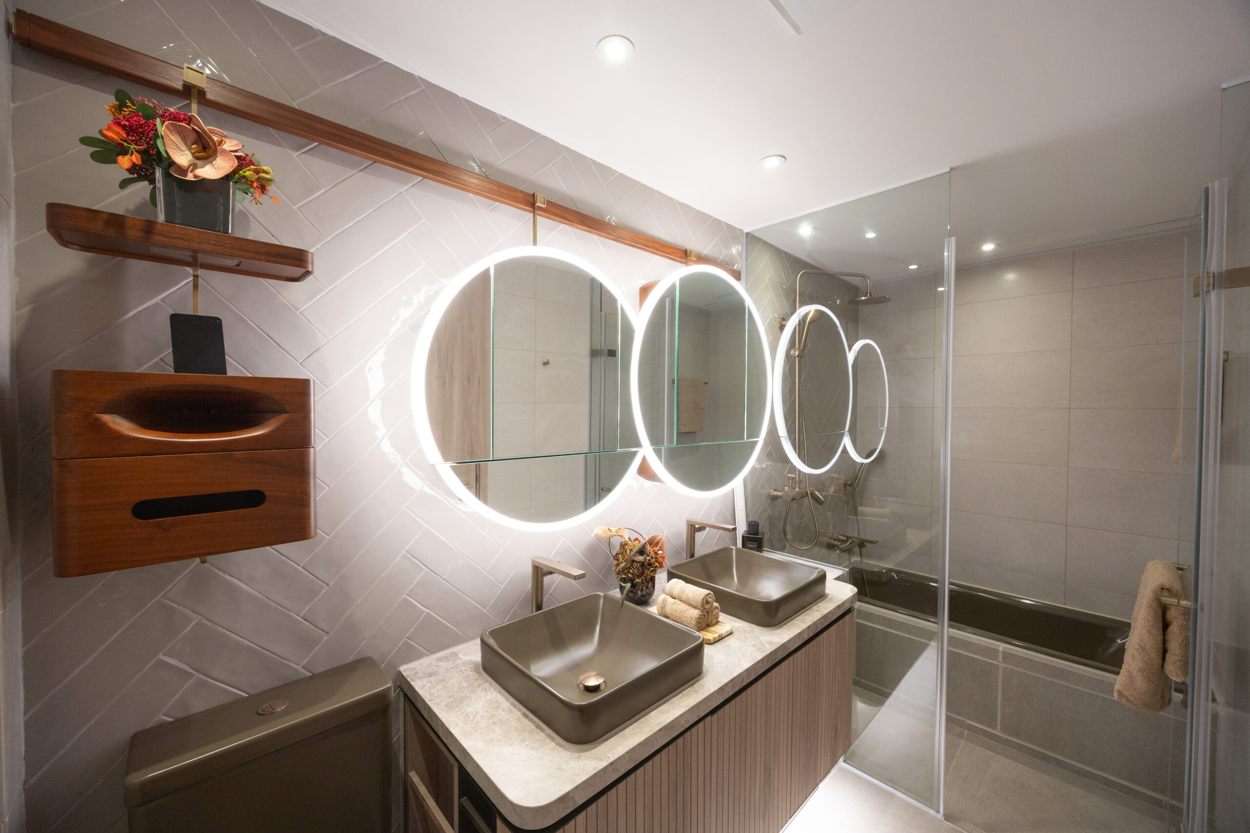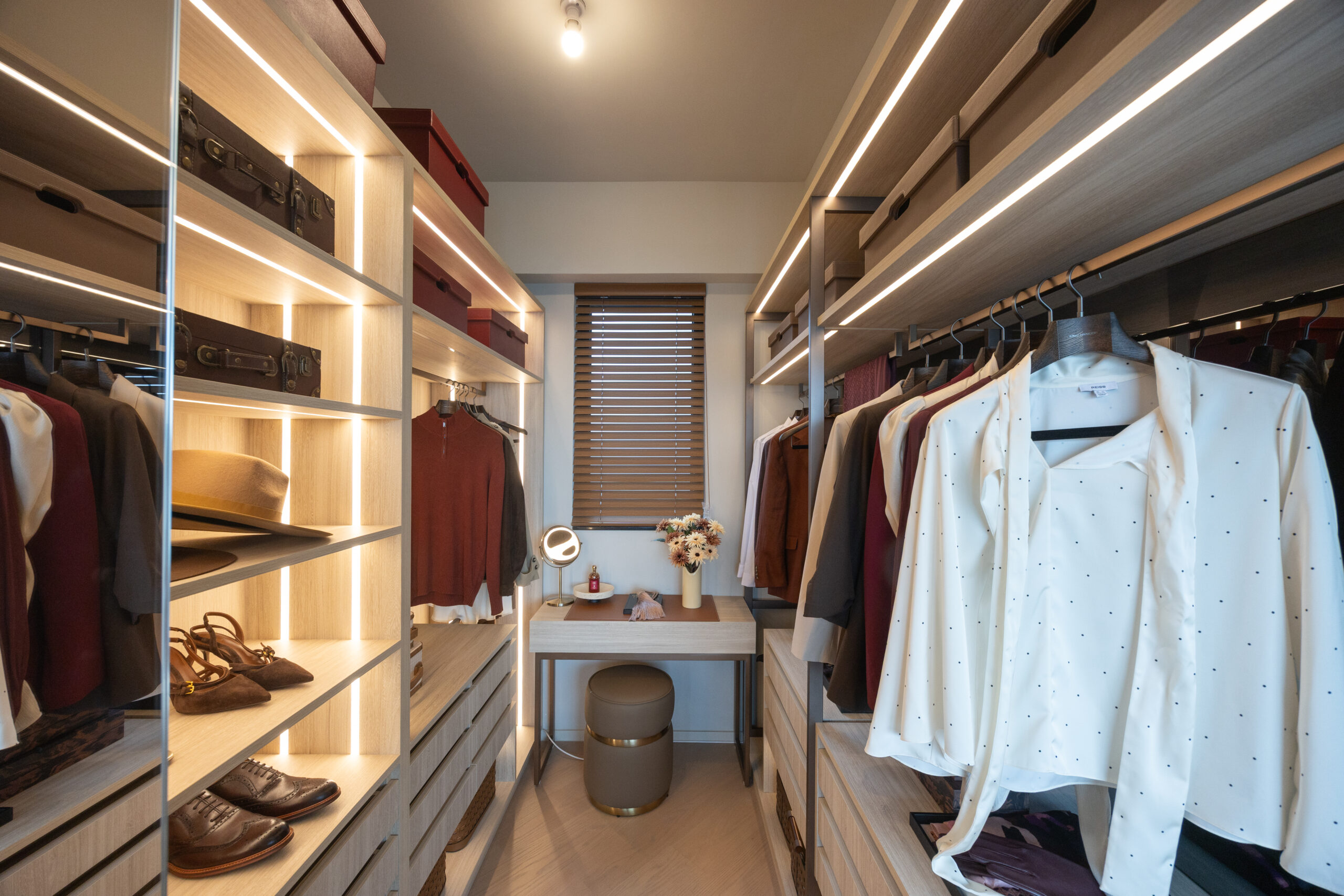 示範單位單位以「藏紅花」作為設計靈感,客廳與睡房同向,飽覽最前席城門河景,配備獨立梗廚,大門旁邊的流線型鞋櫃融入北歐手工主題燈具及高級訂製純素皮革組件,盡顯生活品味。主人睡房為套房設計,空間寬裕更預留位置作衣帽間,體貼用心,並設有對流窗,令空氣對流更佳。