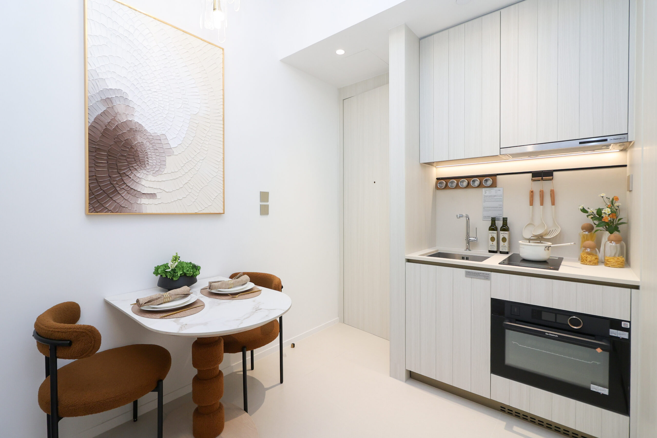 單位門鎖同樣採用來自美國矽谷的Lockly智能門鎖,集合多項先進技術,為住戶全面提升安全性與私隱度。開放式廚房工作枱面充裕,枱面與廚櫃門板選用耐用、易潔材質,表面處理採霧面光澤以減少反光,維持整體視覺的沉穩。配備調味料架及法國皇室御用電器品牌De Dietrich廚房家電,包括電磁煮食爐、抽油煙機、蒸焗爐及雪櫃。開放式廚 房旁配置二人餐檯,並配以古典雅致水晶吊燈,為用餐區域提供層次分明的照明,時尚優雅有格調。