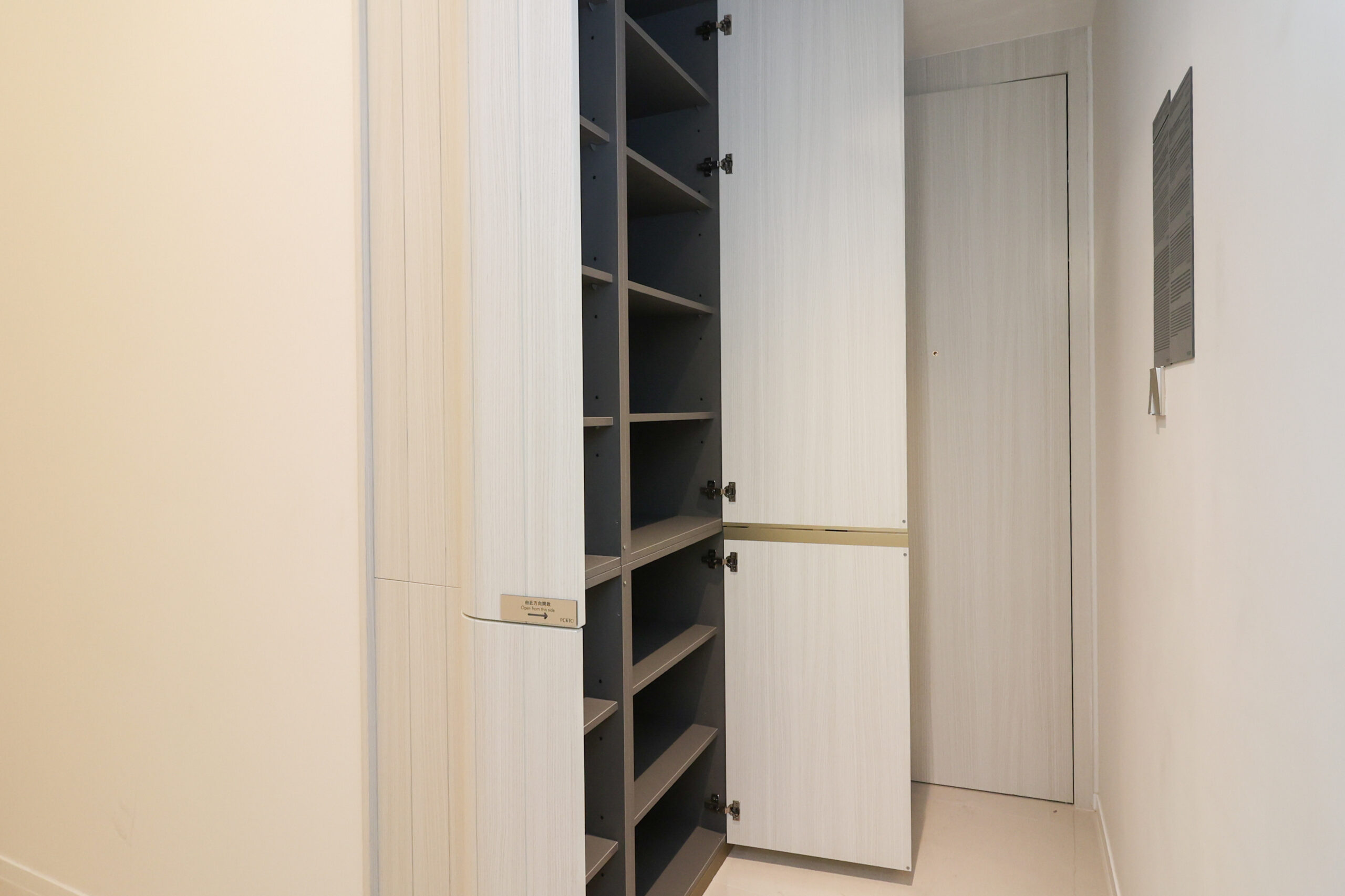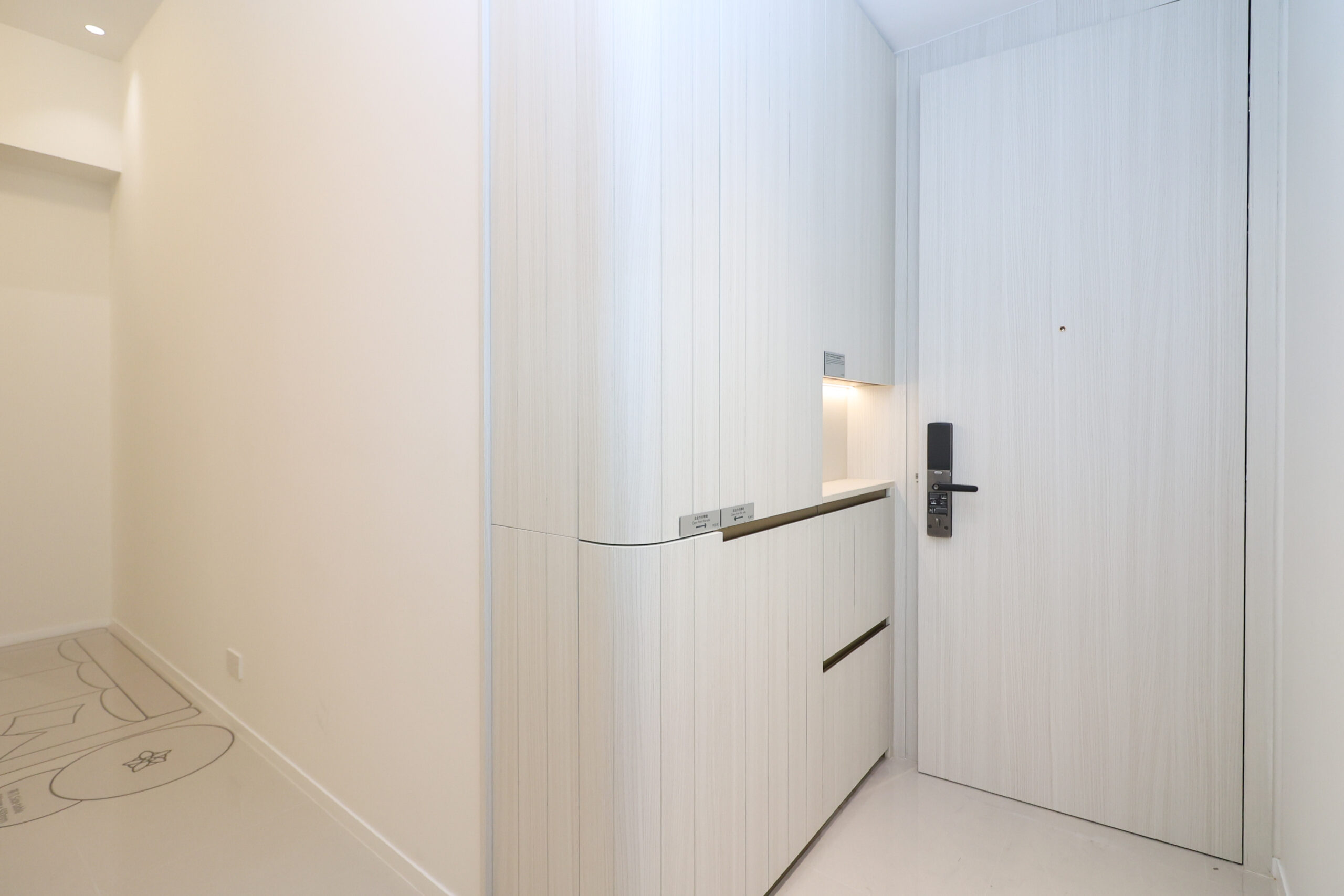 單位為兩房梗廚設計,實用面積438方呎,單位門鎖採用來自美國矽谷的 Lockly智能門鎖,為住戶提供更高層次的保障。甫進入單位,玄關右側位置配備了一組嵌入式的淺木色置頂玄關櫃,玄關櫃長逾一米,附設多個層板及掛架,住戶可放置 鞋類、無線吸塵機及其他生活用品,提供充裕的收納空間。玄關櫃中空位置設小枱面,方便住戶回到家後放置鑰匙等配件。