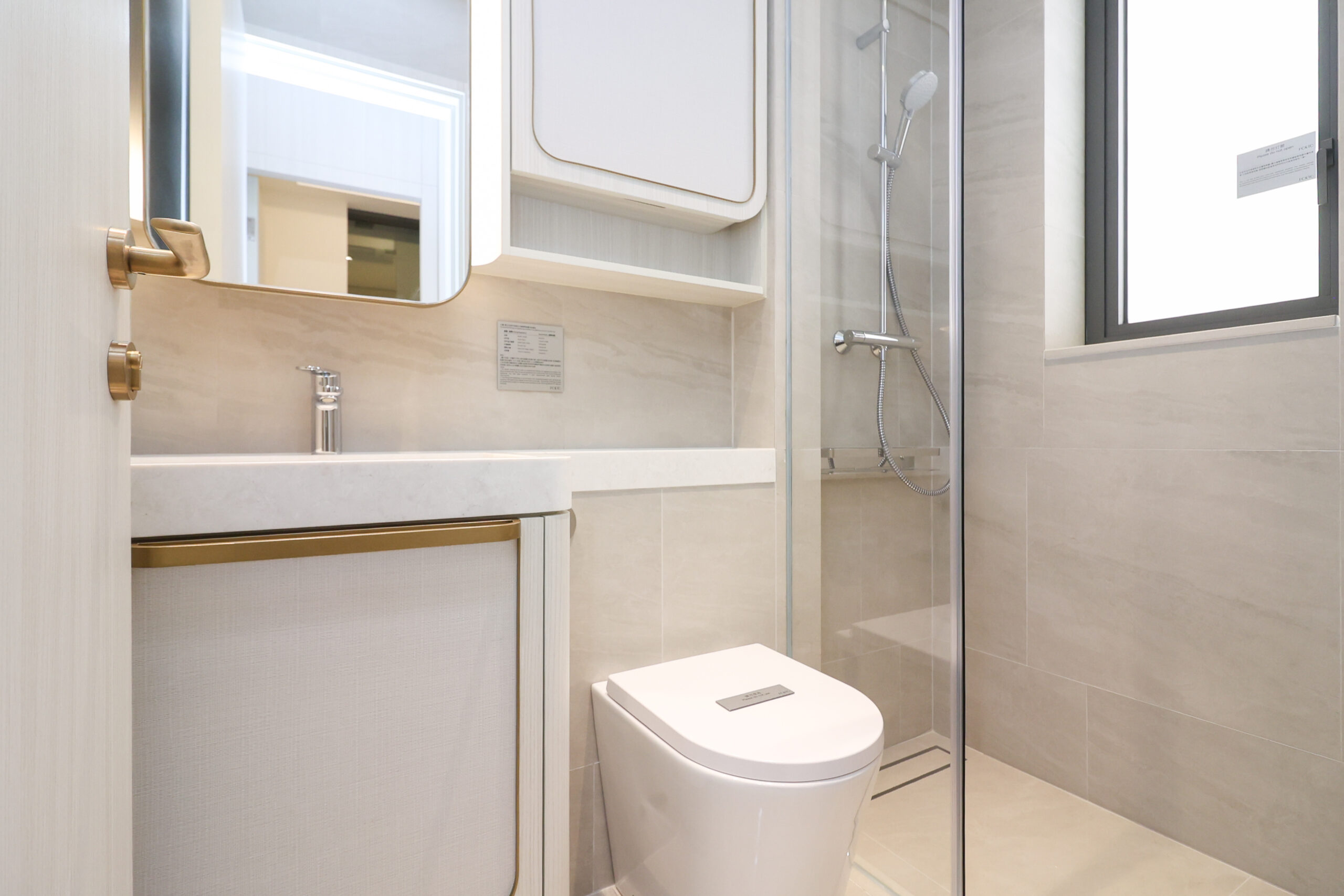 浴室設有窗戶,整體設計以明亮簡潔為主,採用米白色及灰色色調配合金屬點綴的洗手盤 櫃及鏡櫃,空間更顯寬敞整潔。浴室配備獨立淋浴間、洗手盆及坐廁,淋浴區域配備了 德國頂級衛浴品牌 Hansgrohe 的雨淋式花灑和多功能水龍頭套裝。另外亦設備Panasonic樂聲浴室寶,方便住戶在潮濕季節保持乾爽。洗手盆上方設置多功能鏡櫃,結合收納與美觀,鏡櫃內部設有分層空間,可整齊擺放護膚品、洗漱用品及日常小物,讓浴室保持簡潔有序。鏡櫃外觀採用防霧設計,搭配柔和燈光,營造高雅氛圍,細節盡顯匠 心。 走廊連接主人房間及睡房,主人房間隔方正,提供了充足的空間擺放衣櫃及床頭櫃。主人房採用偌大廣角玻璃幕牆,可飽覽窗外景色,令室內明淨舒適,愉悅人心。單位另外 一間睡房同樣方正實用,同時設有大窗,採光充足,無論作為睡房或書房皆宜。