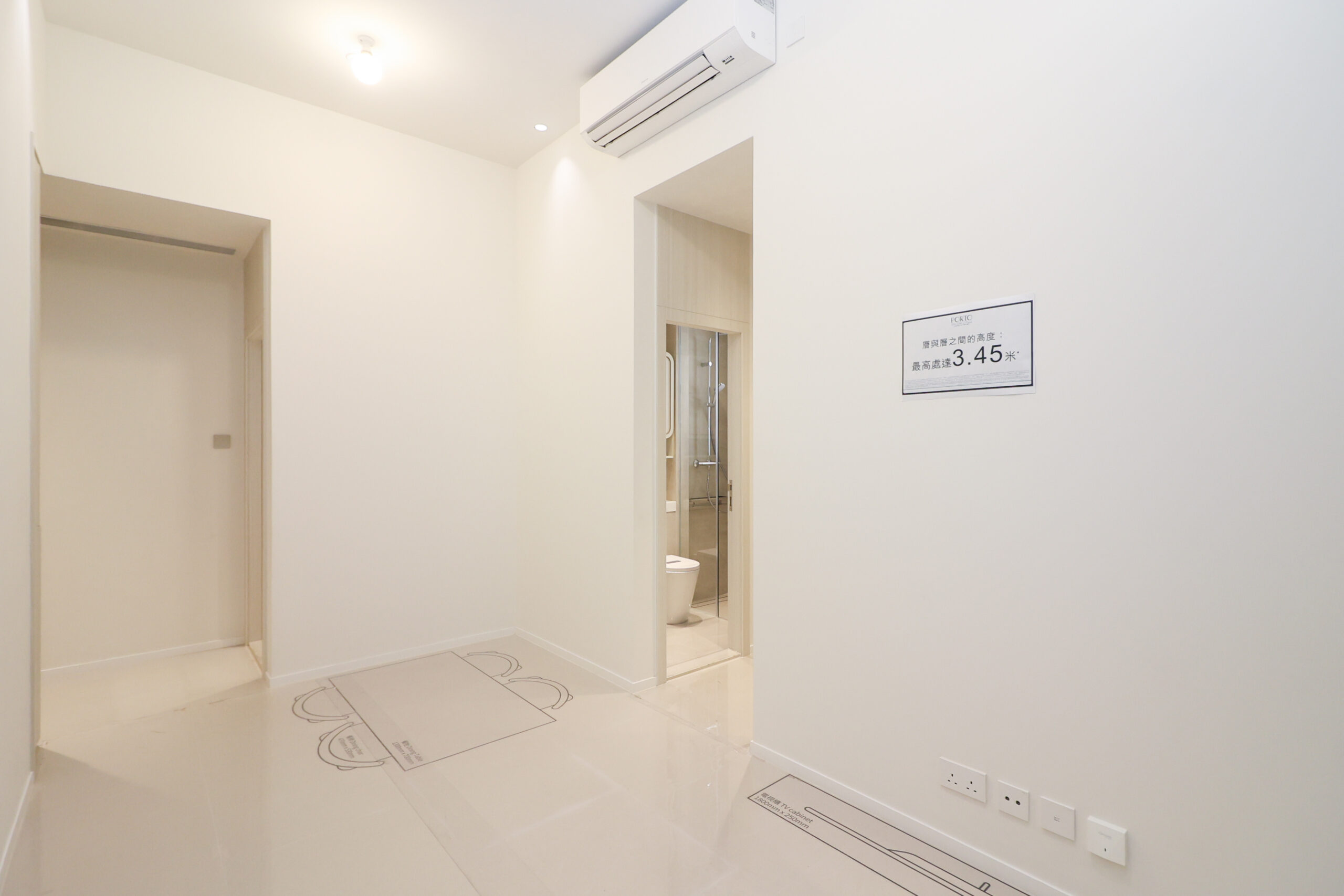 全屋採用淺色系設計,整體配以淺米白色地磚鋪砌,光照明亮;客飯廳呈長方形,空間布局方正,明確劃分出客廳及飯廳空間,並預留大面積牆身予住戶按個人喜好隨意擺放家具。空調系統採用日本Daikin品牌的變頻冷暖分體機,兼具節能與環保效能,並有效過濾及阻隔PM2.5微粒,為住戶營造舒適健康的居住空間。客飯廳連接露台及工作平台,採用落地玻璃趟門設計,充分引入戶外自然光,令室內空間更顯通透開揚,住戶可隨時欣賞室外開揚景緻,享受愜意生活。加上單位層與層之間的高度最高處為3.45米,使客飯廳更顯空間感,住戶亦可靈活善用垂直高度,打造更多收納空間。