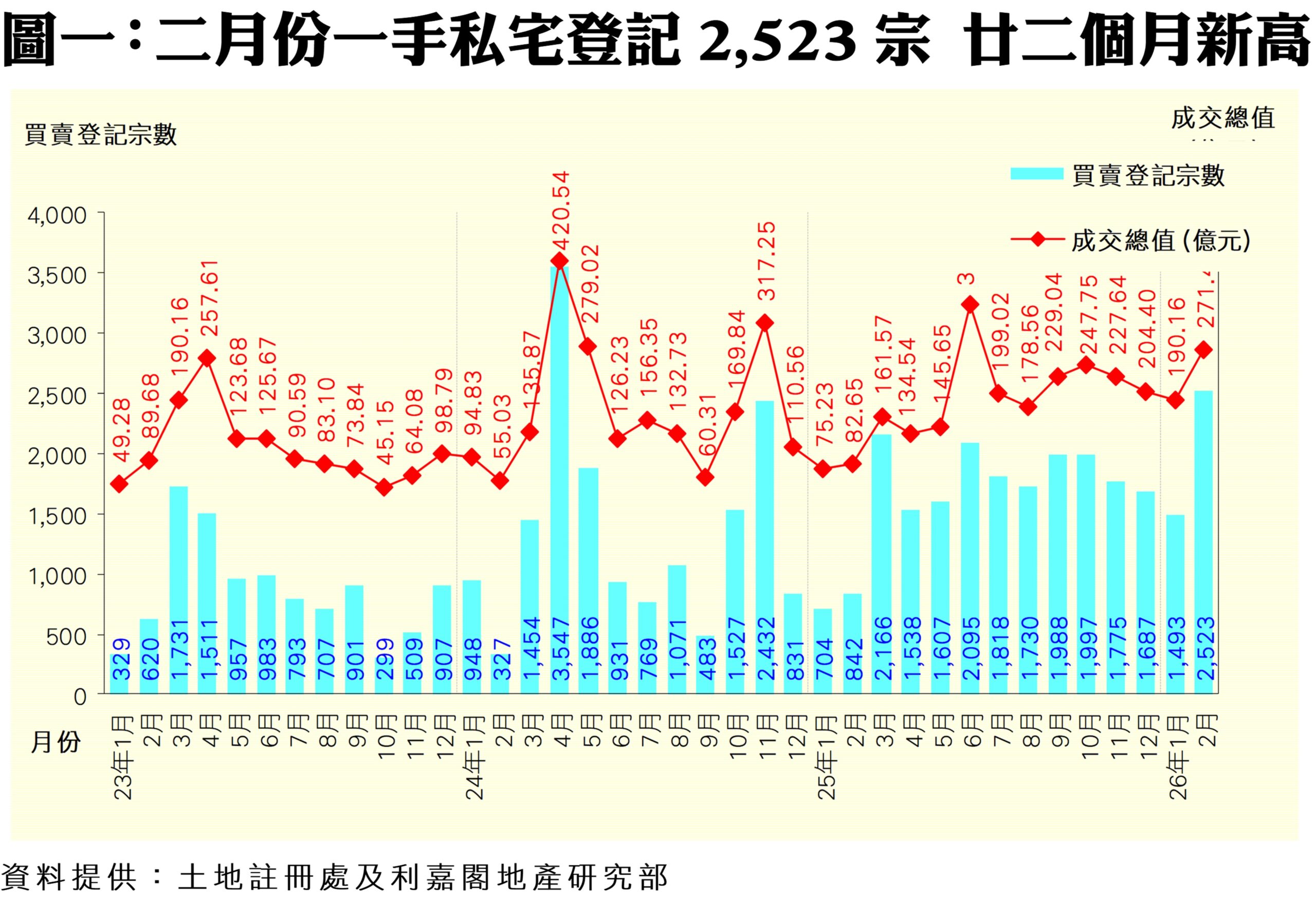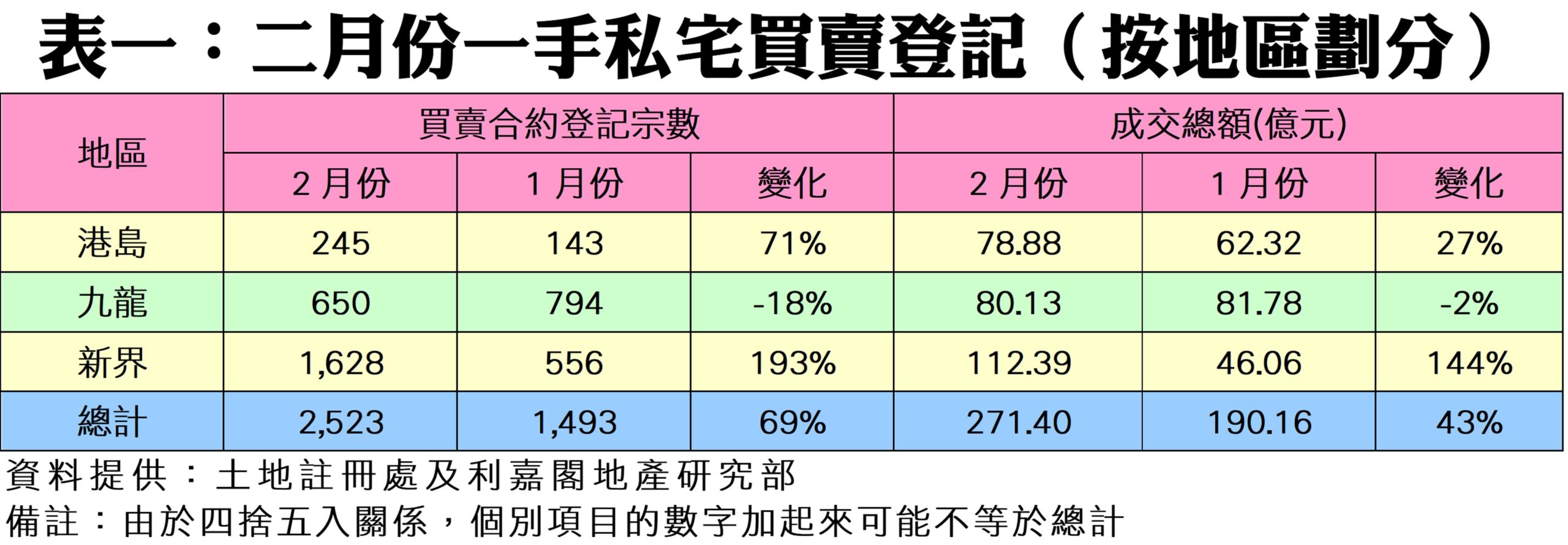 利嘉閣地產研究部主管陳海潮表示,樓市趨升,買家趕新歲前入市,刺激二月新盤登記量急升,旺市氣氛持續,料經農曆新年短暫回氣後,後市可望再現升勢。綜合土地註冊處數據顯示,二月份全港共錄得2,523宗一手私宅買賣登記,總值達271.40億元,較一月的1,493宗及190.16億元分別大升69%及43%,兩者均終止3連跌後反彈,當中量創近22個月新高,而值則為近8個月最多,以量計,更是連續12個月維持在逾一千宗以上的水平,亦是期內第三度破二千宗水平,盡顯過去一年大旺市況。