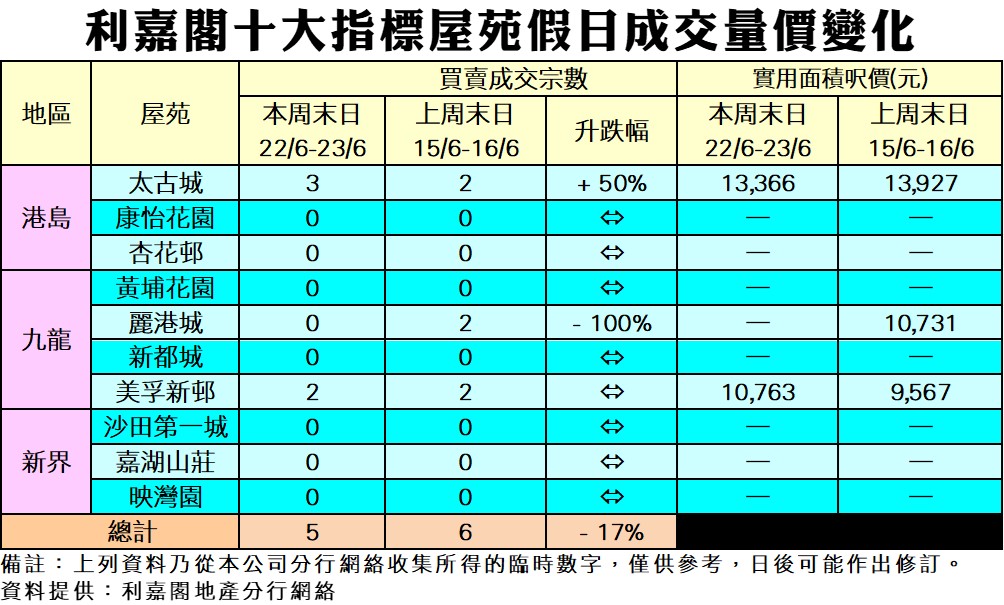 《利嘉閣十大指標屋苑假日二手實況》 市場氣氛淡靜 減息未見蹤影 新盤強勢搶攻 周六日十大屋苑錄5宗買賣 按周跌17% 研究報告 2024-06-23 by Cheung Cyrus · Published 2024-06-23