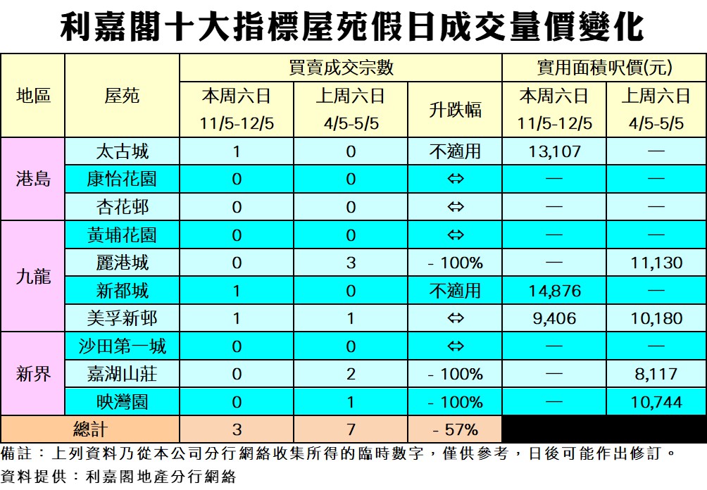 《利嘉閣十大指標屋苑假日二手實況》 新盤低開吸客 息口走勢未明 二手氣氛壓抑 周末十大屋苑錄3宗買賣 按周急挫57% 研究報告 2024-05-12 by Cheung Cyrus · Published 2024-05-12