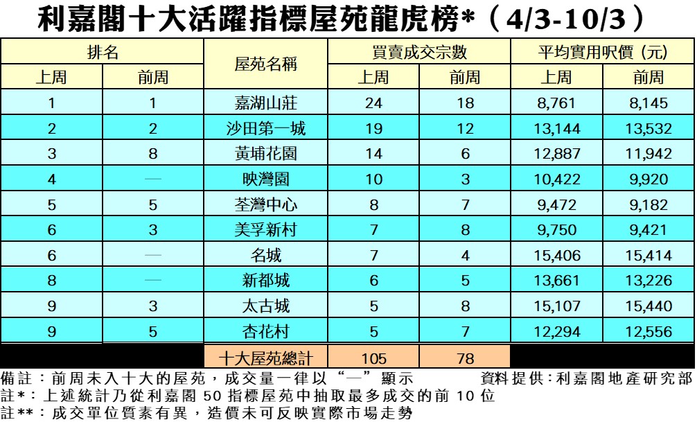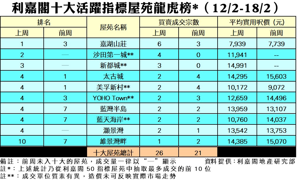 十大活躍指標屋苑上周買賣26宗 嘉湖山莊重奪榜首 錄6宗成交 研究報告 2024-02-21 by Cheung Cyrus · Published 2024-02-21 · Last modified 2024-03-06