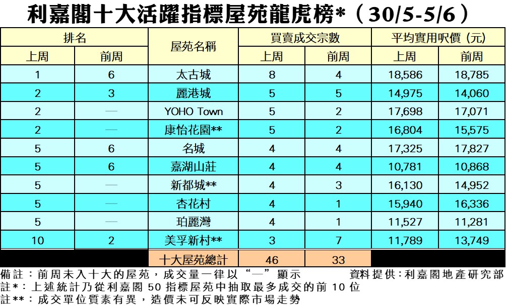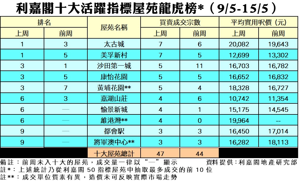 《利嘉閣十大指標屋苑假日二手實況》 一手新盤搶客 交投受到擠壓 十大屋苑周末買賣9宗 按周減少31% 研究報告 2022-05-22 by Cheung Cyrus · Published 2022-05-22