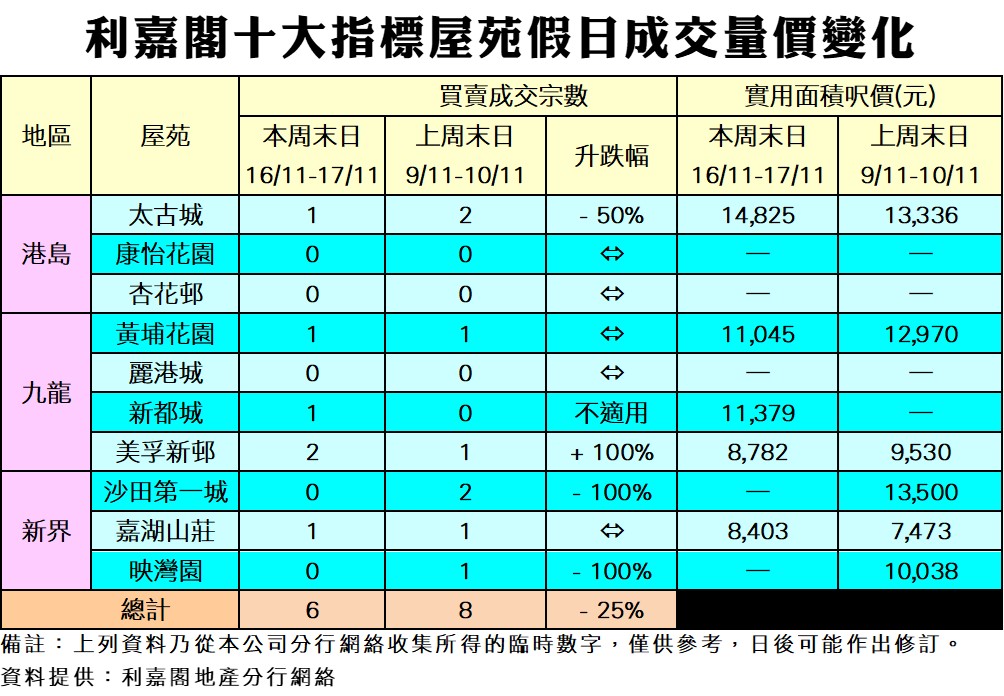 《利嘉閣十大指標屋苑假日二手實況》 政策提振力度稍遜 買家表現略趨審慎 十大屋苑周末錄6宗成交 按周減少25% 研究報告 2024-11-17 by Cheung Cyrus · Published 2024-11-17