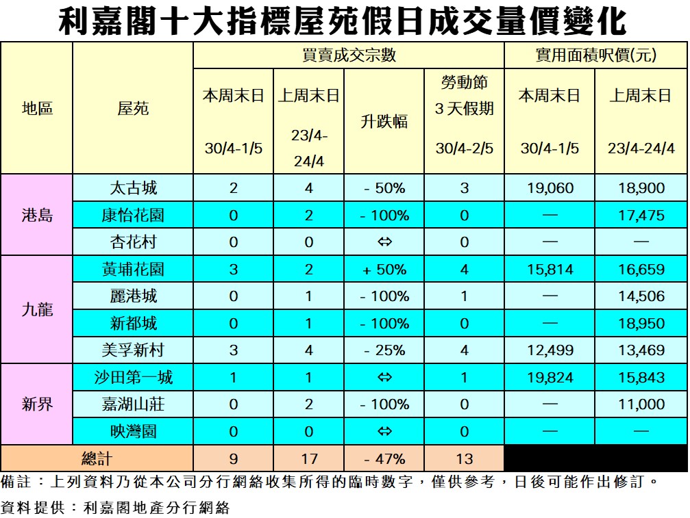 《利嘉閣十大指標屋苑假日二手實況》 市場氣氛暢旺 新盤登場搶焦點 十大屋苑周末成交9宗 勞動節3天13買賣 研究報告 2022-05-02 by Chan Derek · Published 2022-05-02