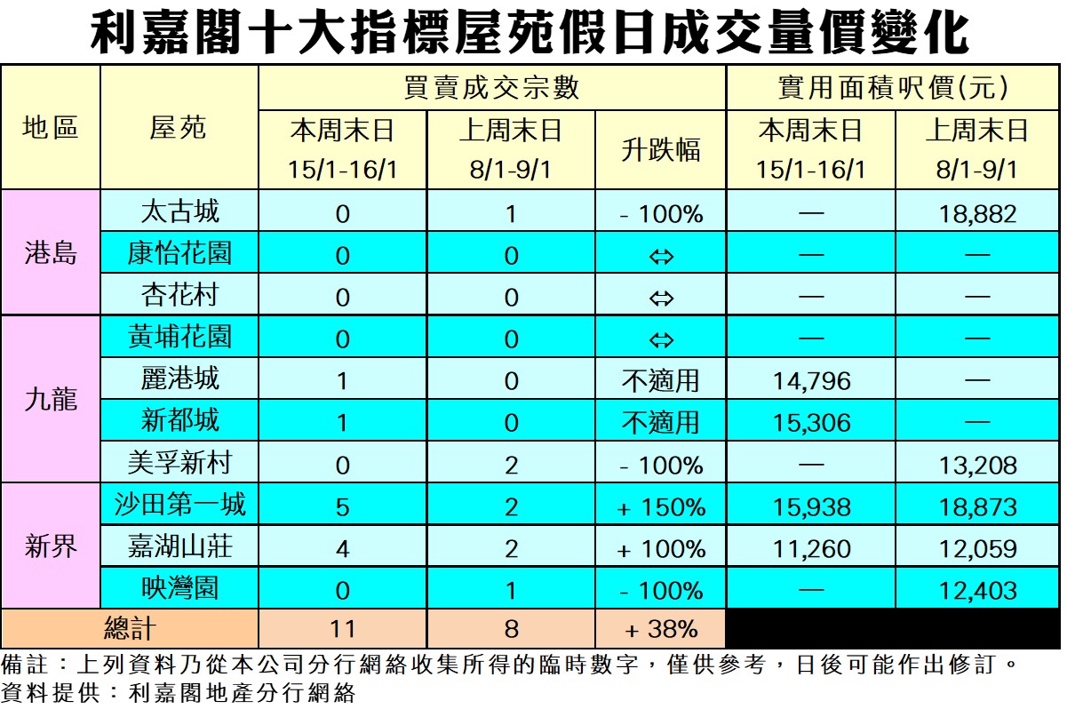 《利嘉閣十大指標屋苑假日二手實況》 買家聚焦二手平盤 議幅擴大有承接力 十大屋苑周末錄11宗買賣 按周增加38% 研究報告 2022-01-16 by Mak Wing · Published 2022-01-16 · Last modified 2022-01-17
