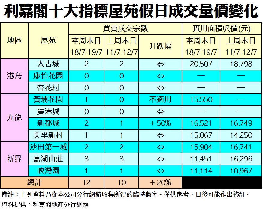 《利嘉閣十大指標屋苑假日二手實況》 疫情反彈 睇樓量跌 未礙入市 十大屋苑周末交投12宗 近三周最多 研究報告 2020-07-19 by Chan Derek · Published 2020-07-19
