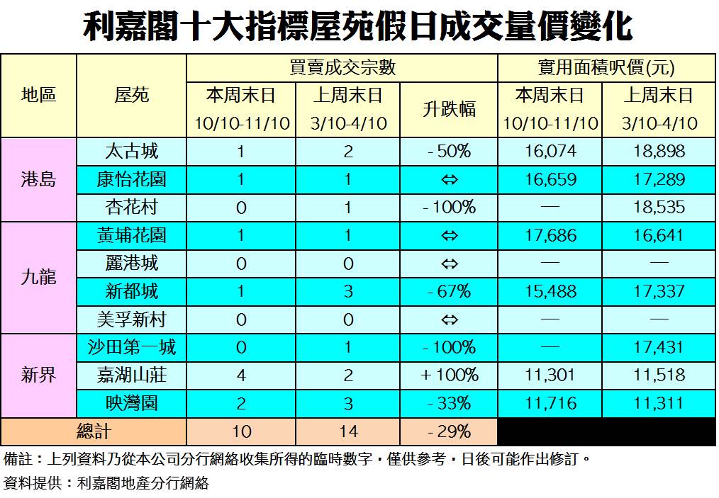 《利嘉閣十大指標屋苑假日二手實況》 市場缺乏一手焦點 二手市場承接力增 十大屋苑周末錄14宗買賣 按周回升5宗 研究報告 2020-10-05 by Chan Derek · Published 2020-10-05