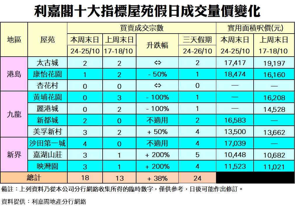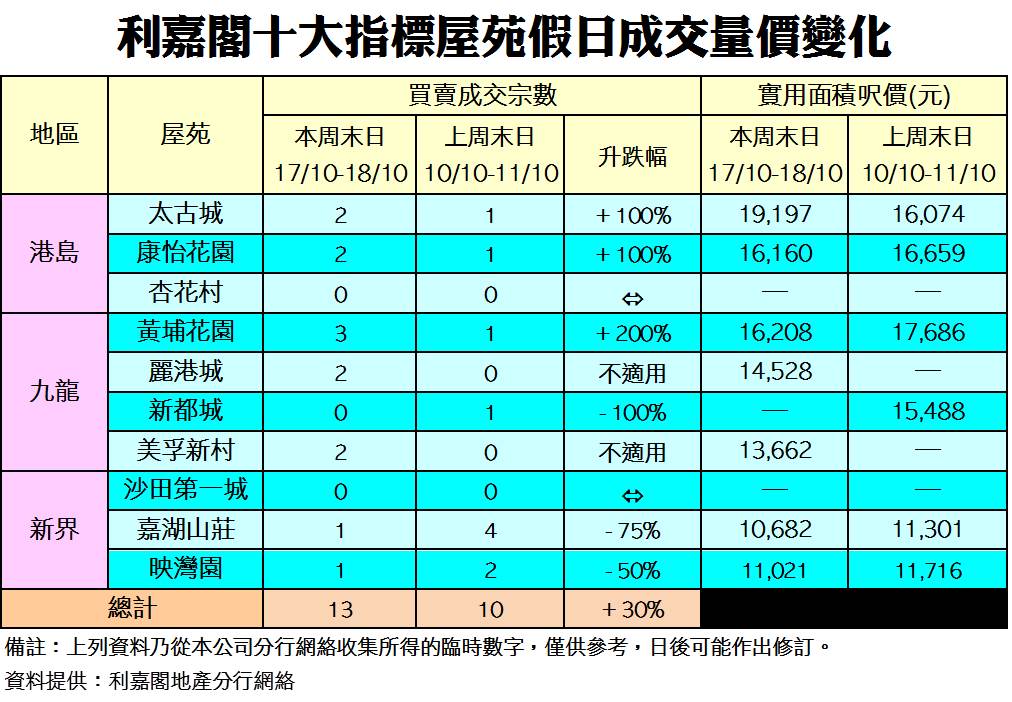 《利嘉閣十大指標屋苑假日二手實況》 新盤帶動交投 向隅客轉攻二手 十大屋苑周末錄13宗買賣 按周回升30% 研究報告 2020-10-18 by Chan Derek · Published 2020-10-18