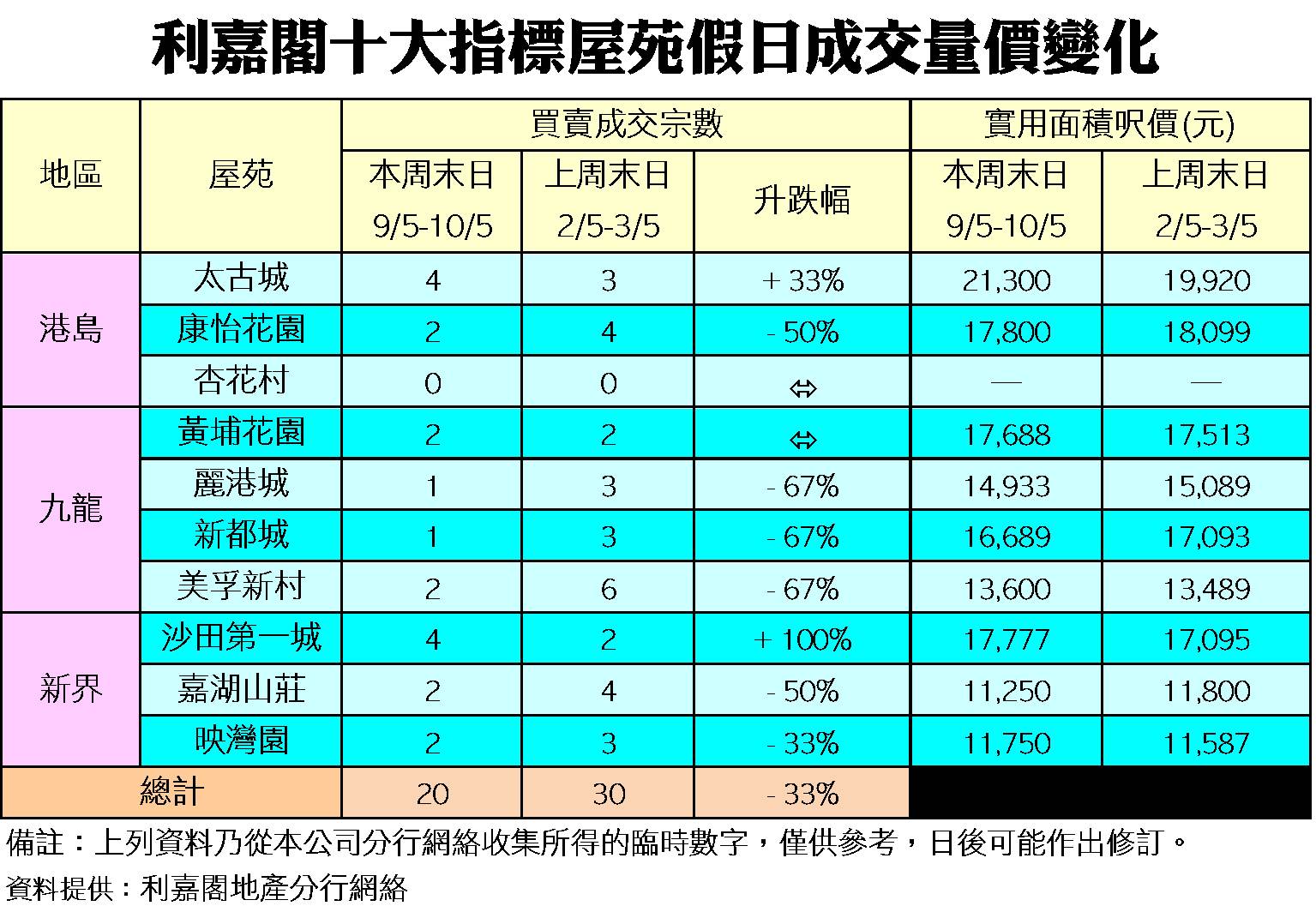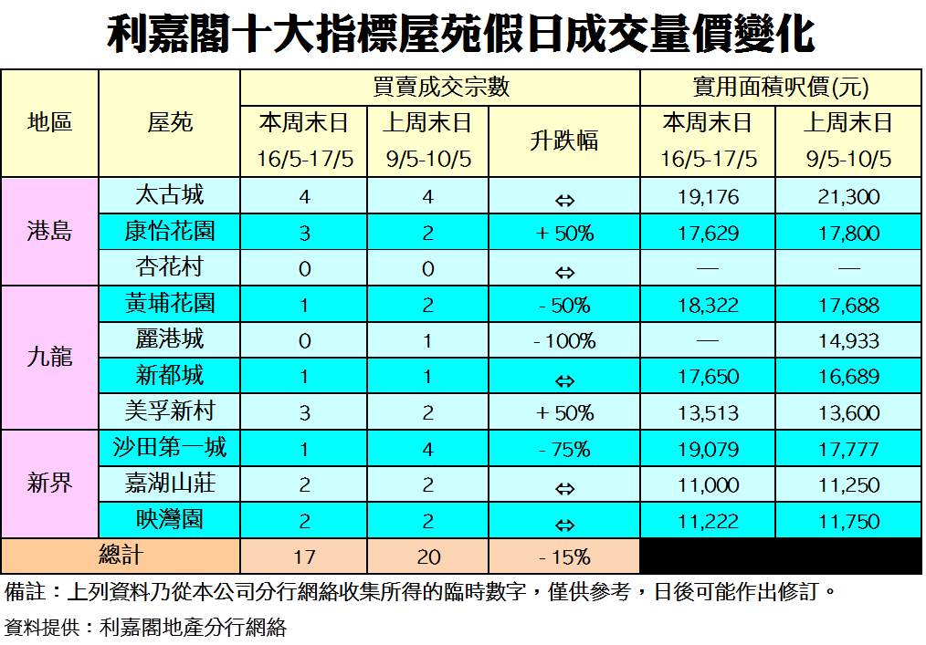 《利嘉閣十大指標屋苑假日二手實況》 二手盤源消化 新盤再次群起 十大屋苑周末錄17宗成交 按周跌15% 研究報告 2020-05-18 by Chan Derek · Published 2020-05-18