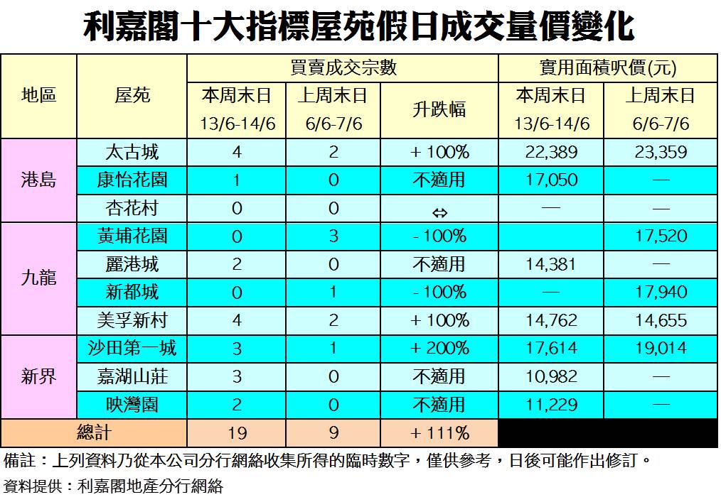 《利嘉閣十大指標屋苑假日二手實況》 一手市場缺乏焦點 買家重投二手市場 十大屋苑周末錄19宗買賣 按周升1.1倍 研究報告 2020-06-15 by Chan Derek · Published 2020-06-15