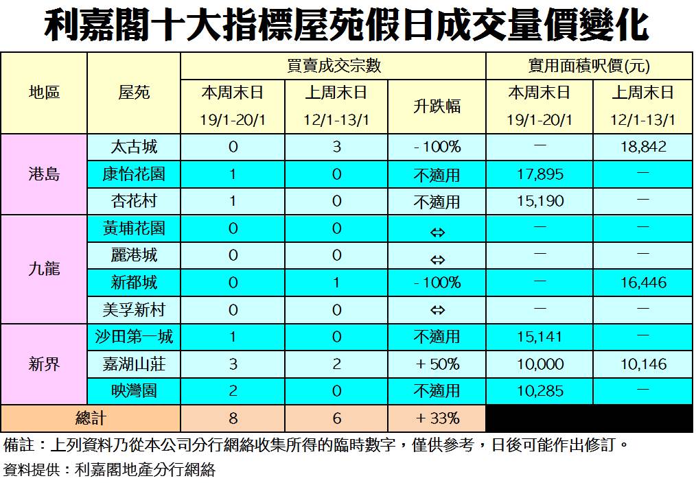 《利嘉閣十大指標屋苑假日二手實況》 一手新盤帶動交投氣氛 樓市乍現小陽春 十大屋苑周末錄8宗買賣 較上周升33% 研究報告 2019-01-21 by Chan Derek · Published 2019-01-21