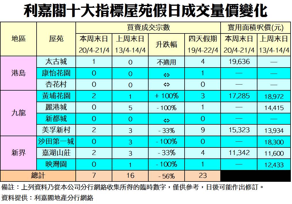 《利嘉閣十大指標屋苑假日二手實況》 假期外遊 周末十大指標屋苑僅錄7宗成交 復活節四天假期累錄23宗成交 較去年少1宗 研究報告 2019-04-23 by Chan Derek · Published 2019-04-23