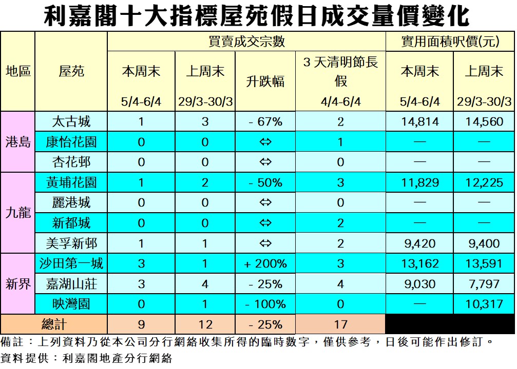《利嘉閣十大指標屋苑假日二手實況》 十大屋苑周末錄10宗買賣 四天長假共13宗 新盤收票激活市場 二手靜待五月議息結果 研究報告 2025-04-22 by Chan Derek · Published 2025-04-22
