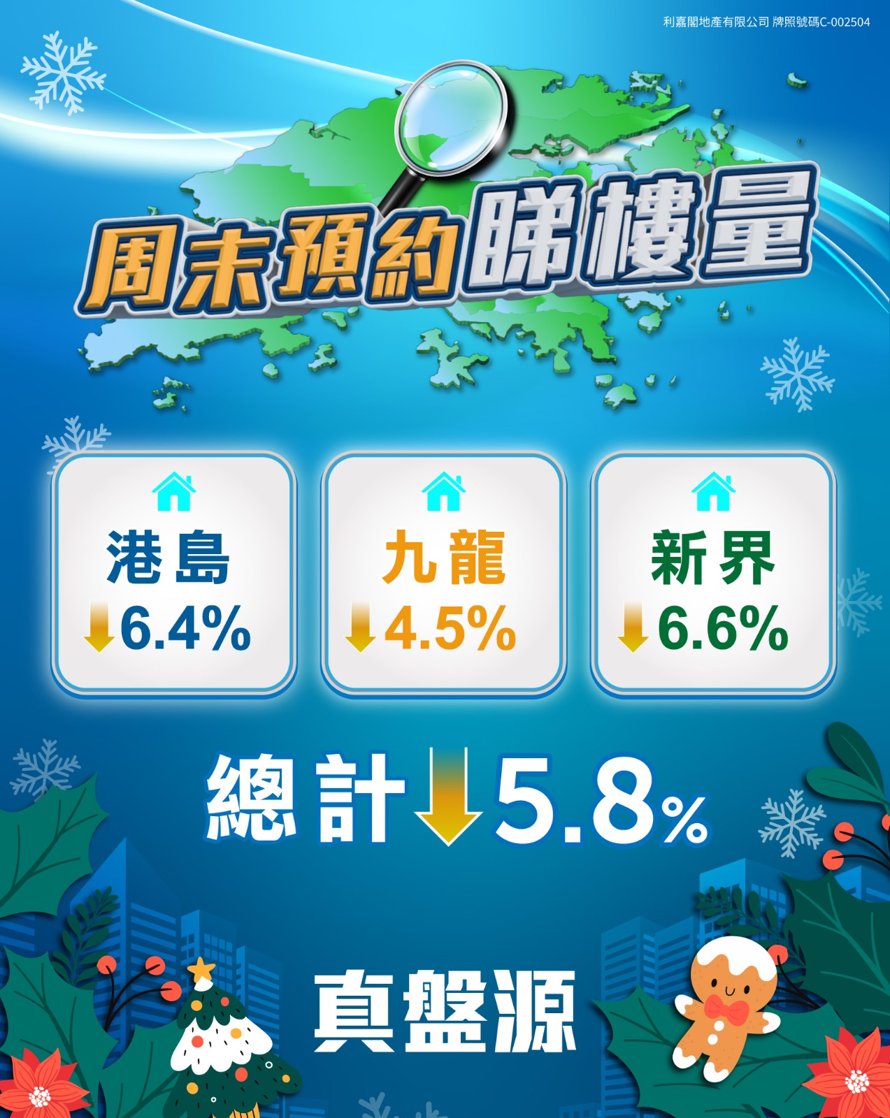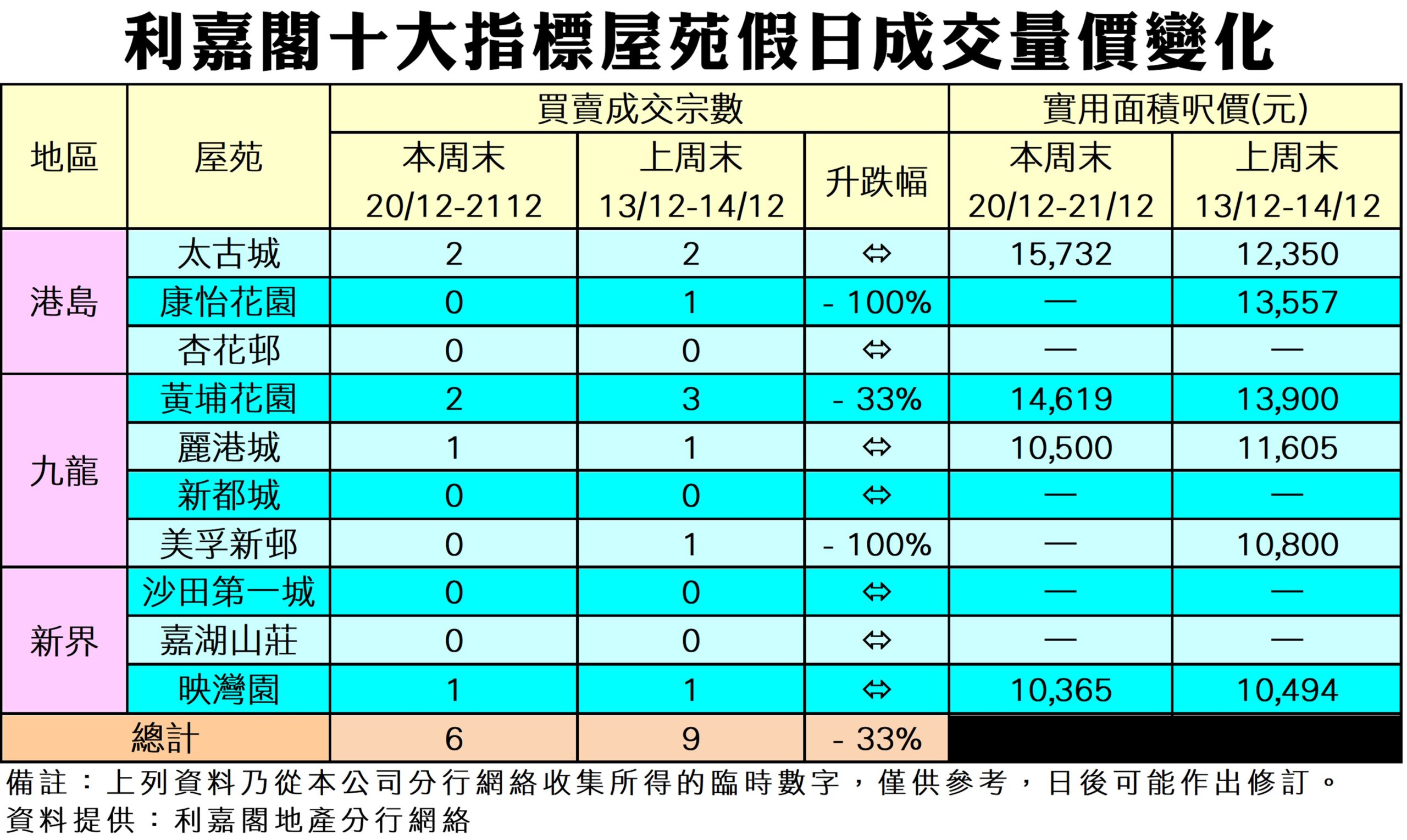 《利嘉閣十大指標屋苑假日二手實況》 聖誕新年長假臨近 外遊氣氛濃厚 十大屋苑周末錄6宗買賣 按周跌33% 研究報告 2025-12-22 by Chan Derek · Published 2025-12-22