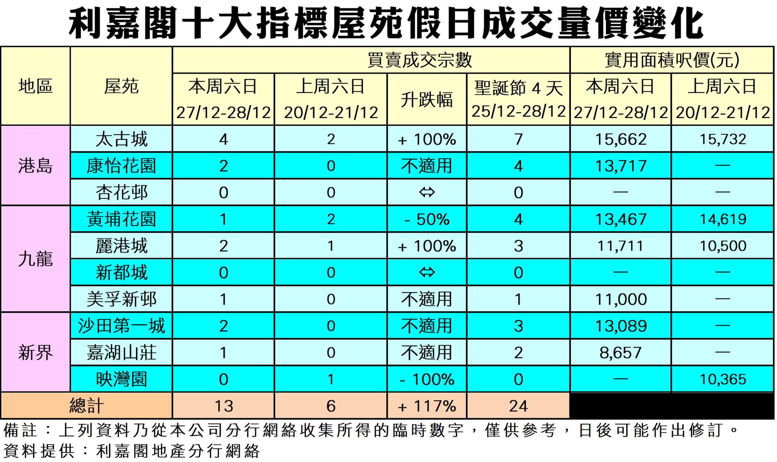 《利嘉閣十大指標屋苑假日二手實況》 新盤市場欠焦點 購買力回流二手屋苑 十大屋苑周末交投倍升 聖誕長假錄24宗 研究報告 2025-12-28 by Chan Derek · Published 2025-12-28