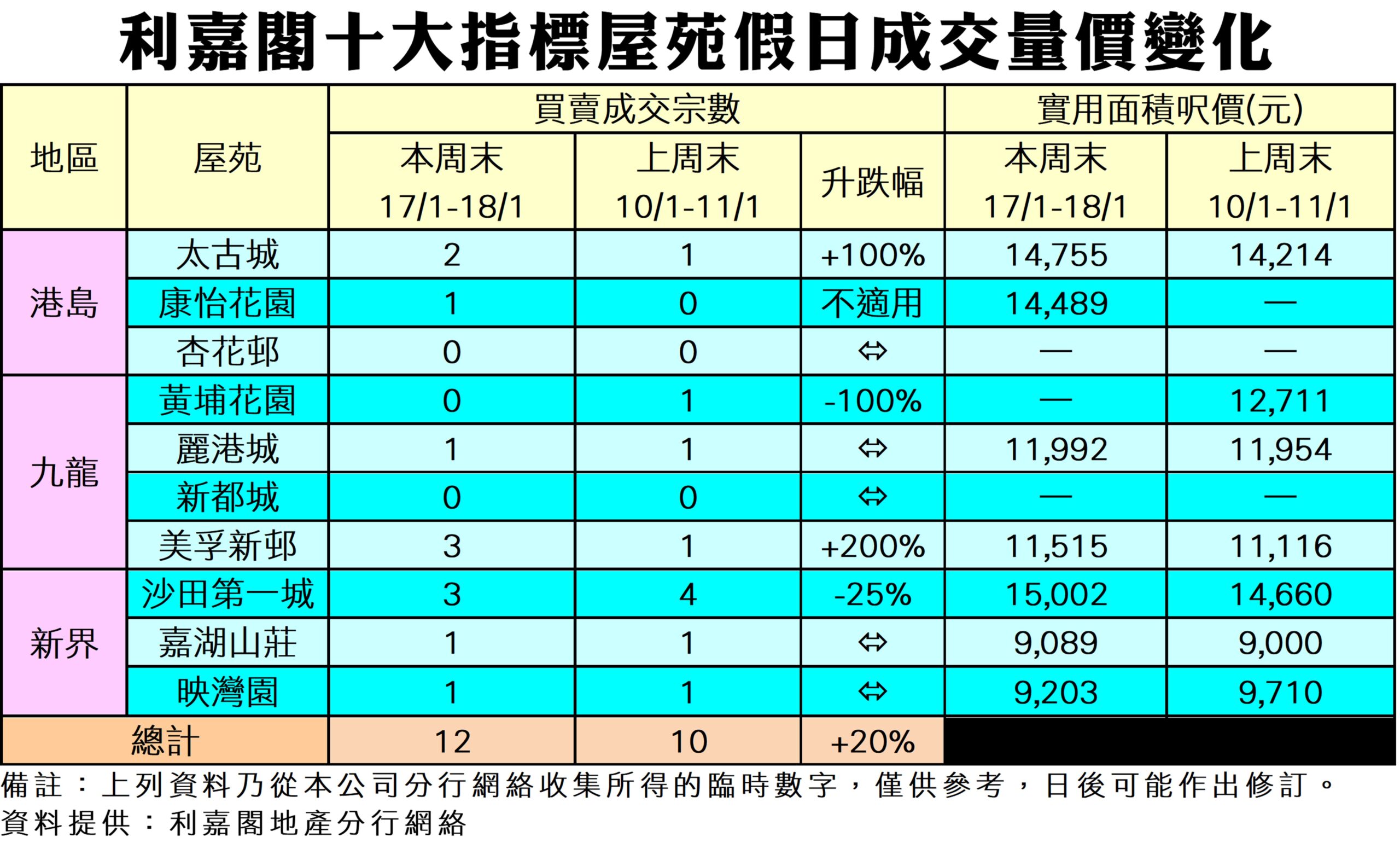 《利嘉閣十大指標屋苑假日二手實況》 新盤熱銷帶動市場氣氛 買家入市信心增強 十大屋苑周末錄12宗成交 再升20% 研究報告 2026-01-18 by HimLau · Published 2026-01-18 · Last modified 2026-01-19
