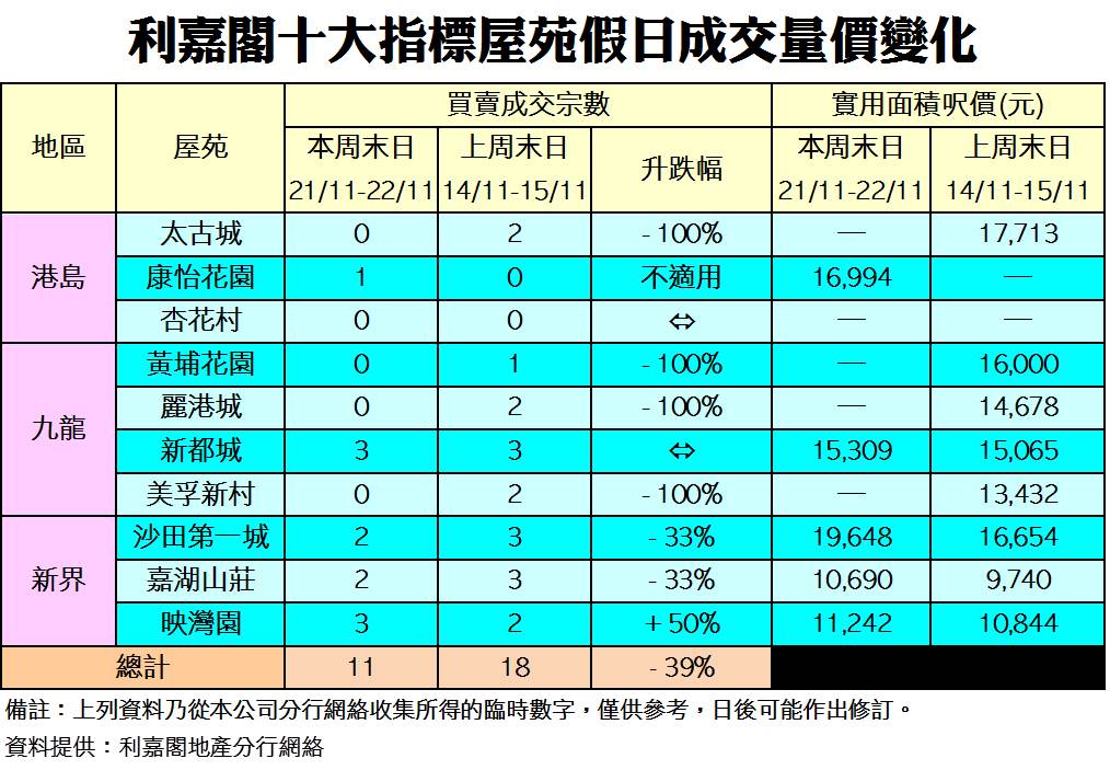 《利嘉閣十大指標屋苑假日二手實況》 疫情轉趨嚴重 二手睇樓量和交投減慢 十大屋苑周末錄11宗買賣 按周跌近四成 研究報告 2020-11-23 by Chan Derek · Published 2020-11-23