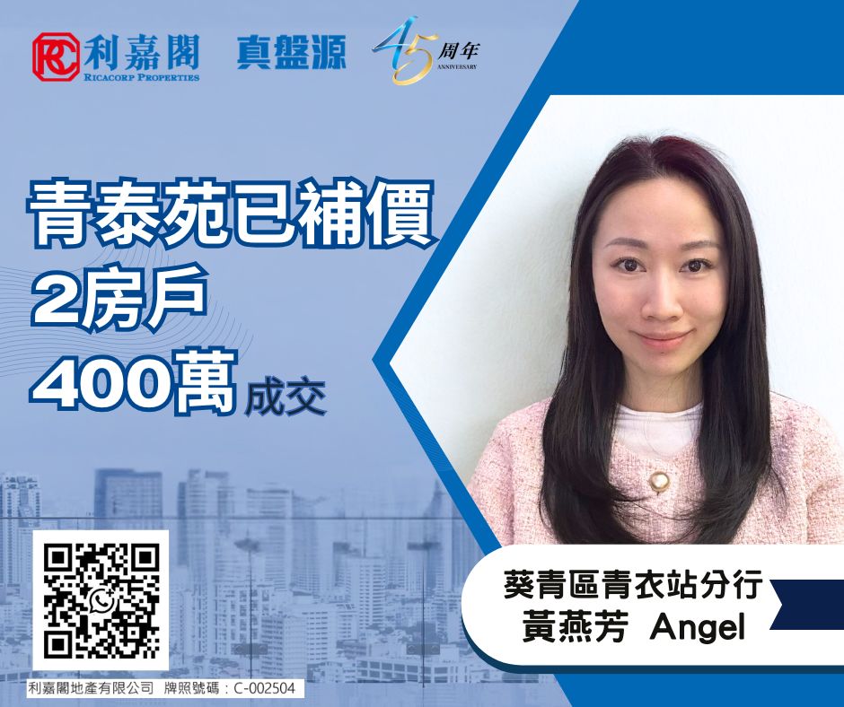 青衣青泰苑已補價2房戶448萬成交 業主2024年買入 物業升值12% 二手動向 2026-04-02 by Connie Li · Published 2026-04-02 · Last modified 2026-04-01