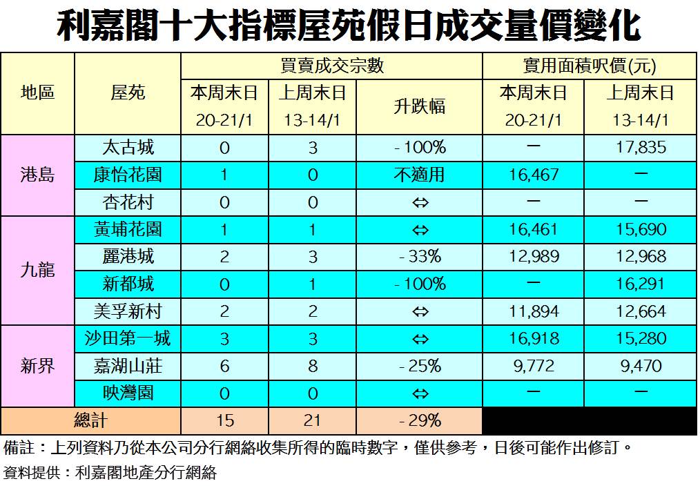 《利嘉閣十大指標屋苑假日二手實況》 二手盤源被市場消化 缺盤下成交量稍放緩 十大屋苑周末錄15宗買賣 按周跌6宗 研究報告 2018-01-22 by Chan Derek · Published 2018-01-22