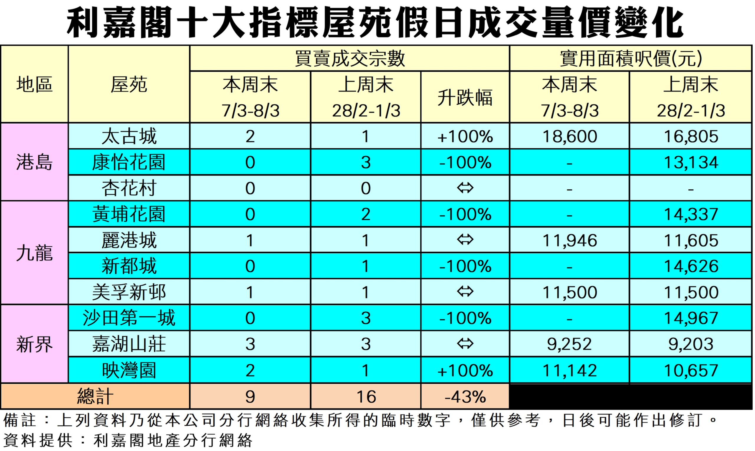 《利嘉閣十大指標屋苑假日二手實況》 新盤魚貫登場搶焦點 吸二手購買力 十大屋苑周末9宗成交 創新高後回落 研究報告 2026-03-09 by Chan Derek · Published 2026-03-09