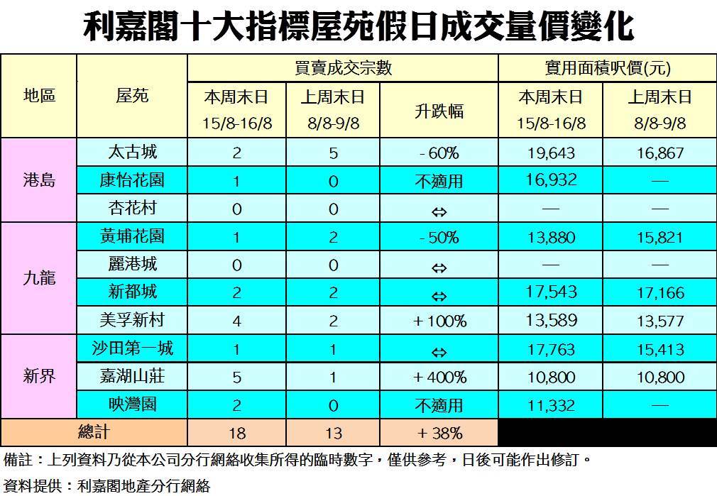 《利嘉閣十大指標屋苑假日二手實況》 二手業主態度軟化 資金按捺不住「撈貨」 十大屋苑周末買賣18宗 近8周新高 研究報告 2020-08-16 by Chan Derek · Published 2020-08-16