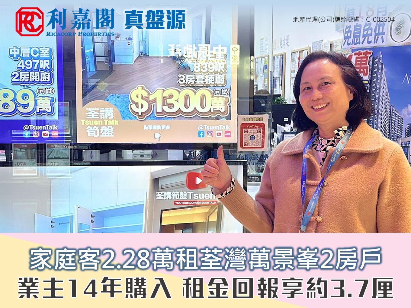 家庭客2.28萬租荃灣萬景峯2房戶 業主14年購入 租金回報享約3.7厘 二手動向 2025-01-04 by Connie Li · Published 2025-01-04 · Last modified 2025-01-03