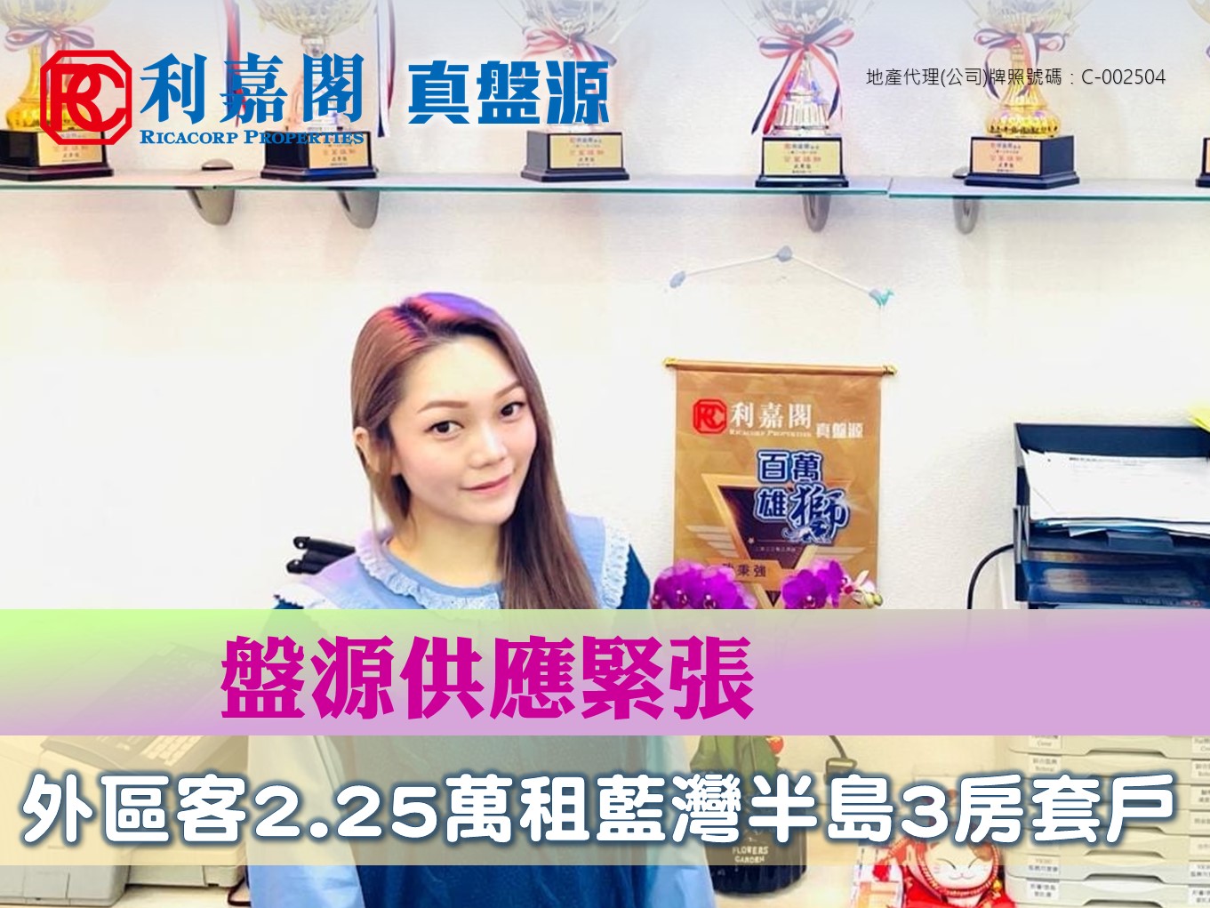 盤源供應緊張 睇啱即租 外區客22500元租藍灣半島3房套戶 二手動向 2024-08-03 by Lam Polly · Published 2024-08-03 · Last modified 2024-08-02